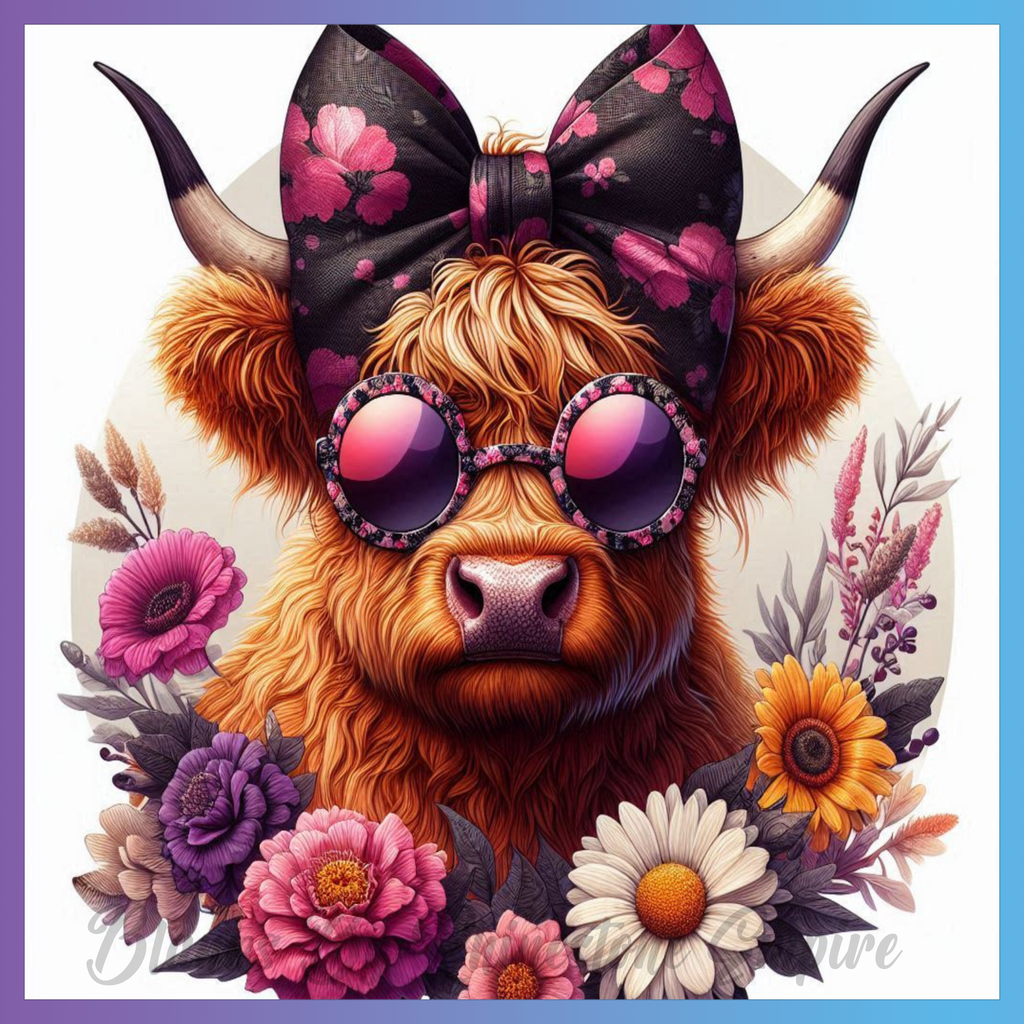 Theme: Cow with flowers, bow, sunglasses, colorful.