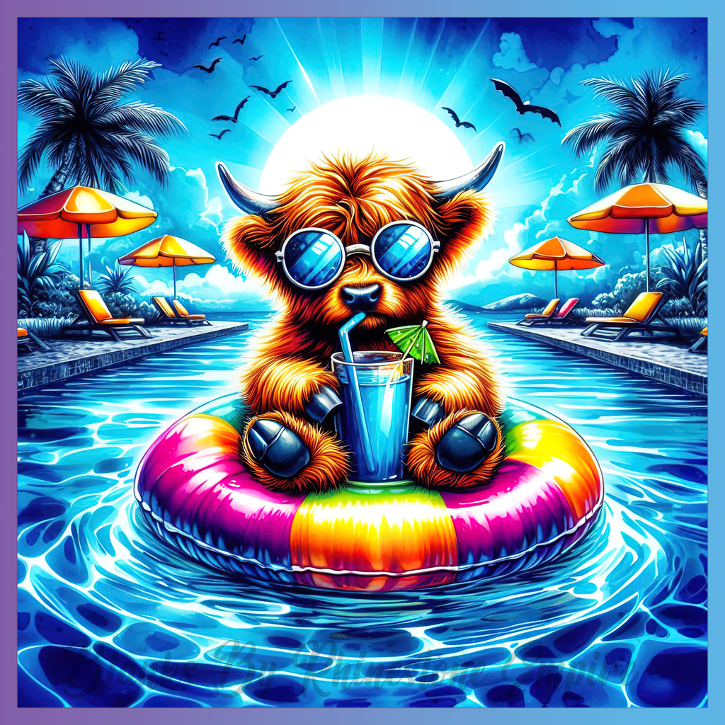 Theme: Bull with pool, sunglasses, drink, float.