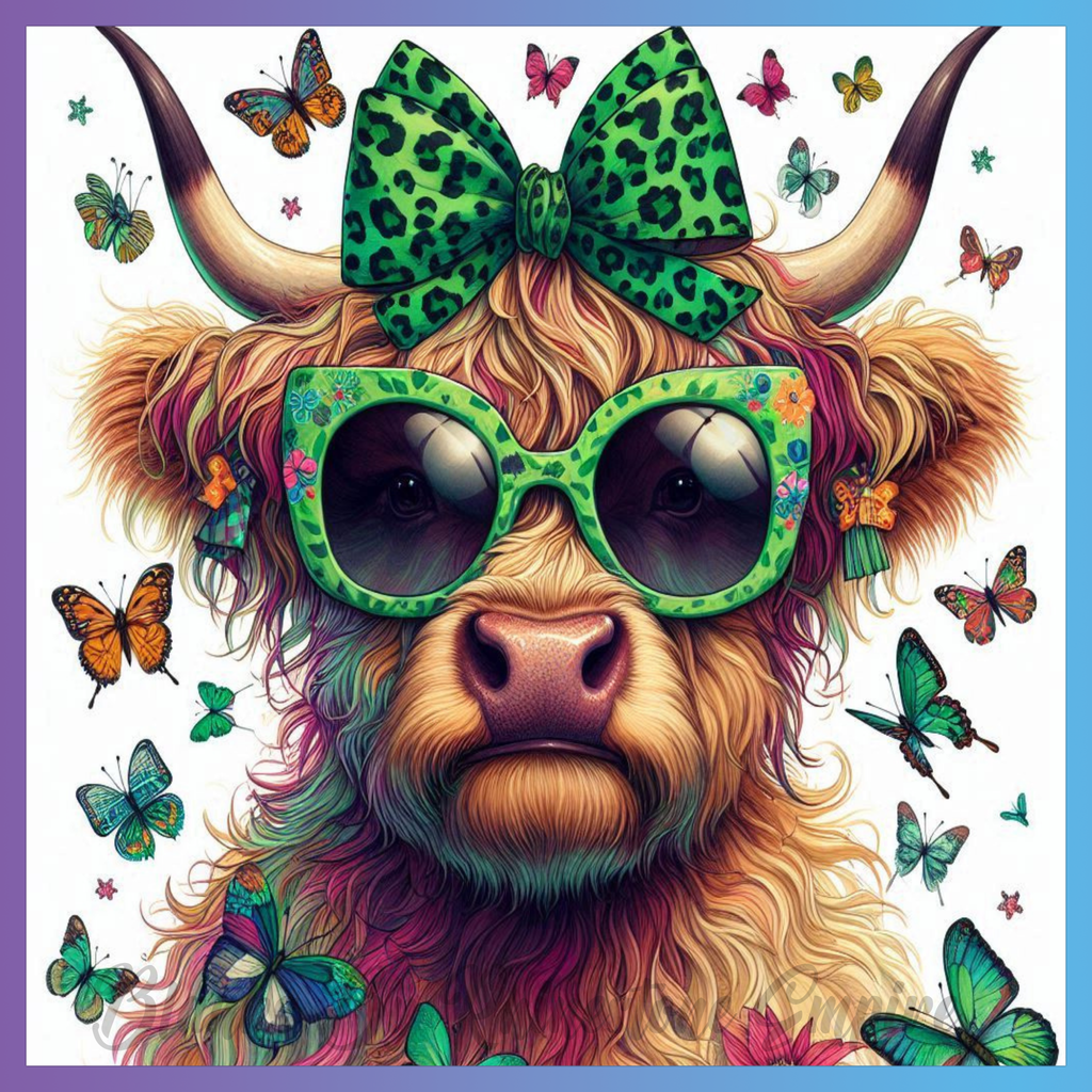 Theme: Cow with glasses, bow, butterflies, colorful.