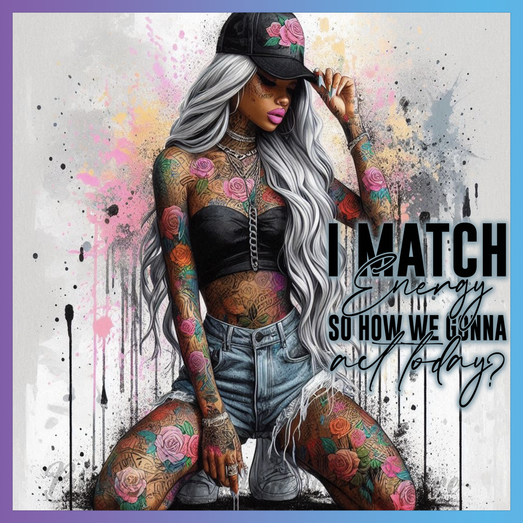 Theme: Girl with tattoo, flowers, cap, gray hair.