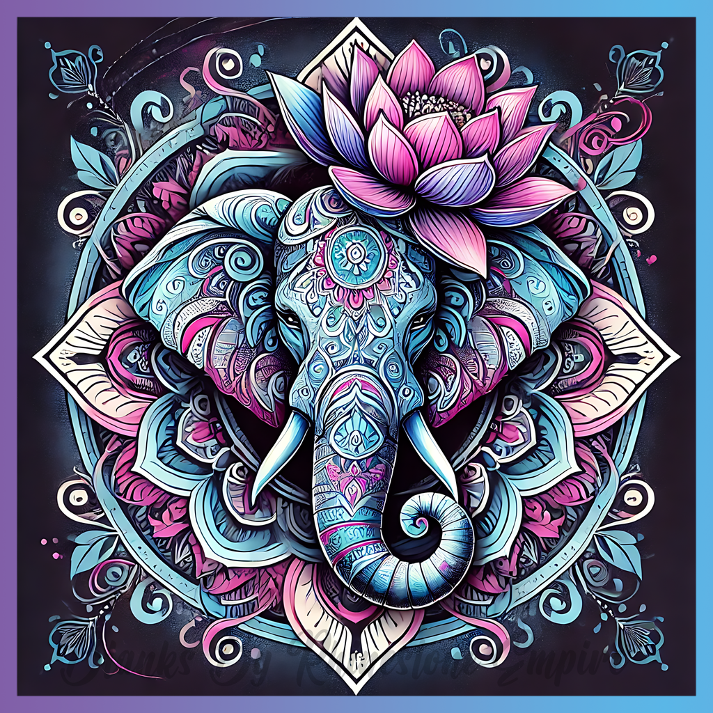 Theme: Elephant with lotus, mandala, ornate, colorful.