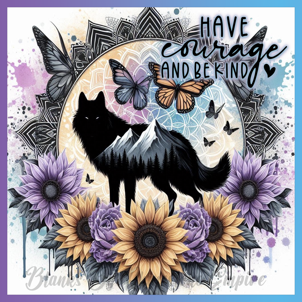 Theme: Wolf with mountains, butterflies, sunflowers, mandala.