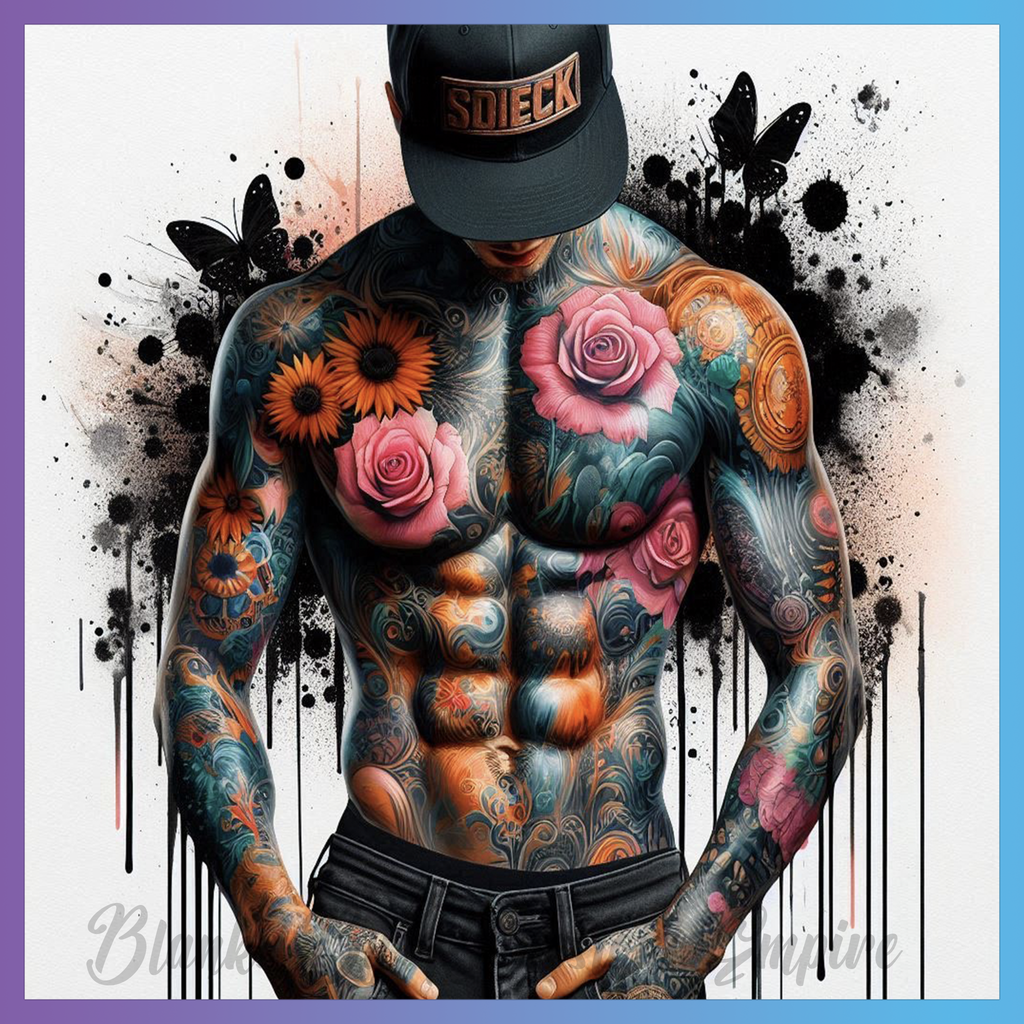Theme: Man with tattoo, flowers, muscles, cap.