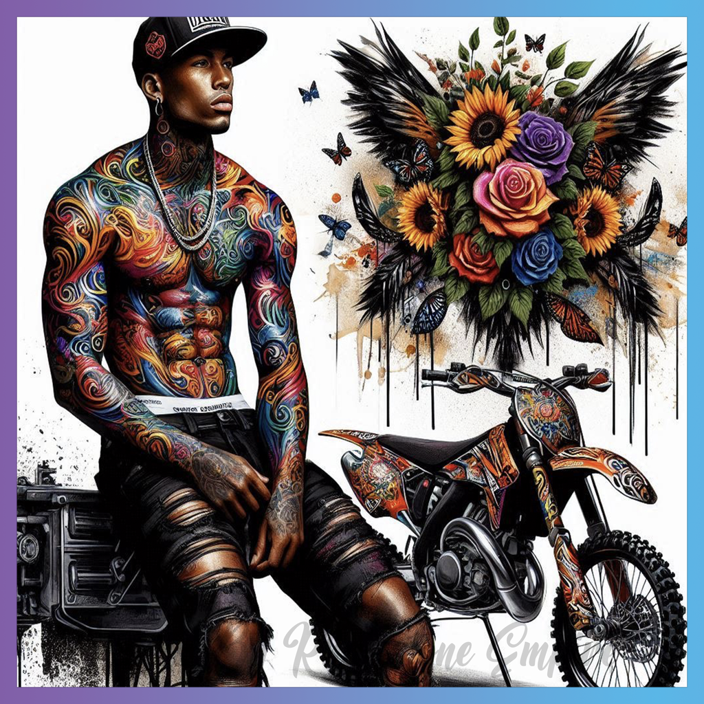 Theme: Man with tattoos, motorbike, flowers, colorful.