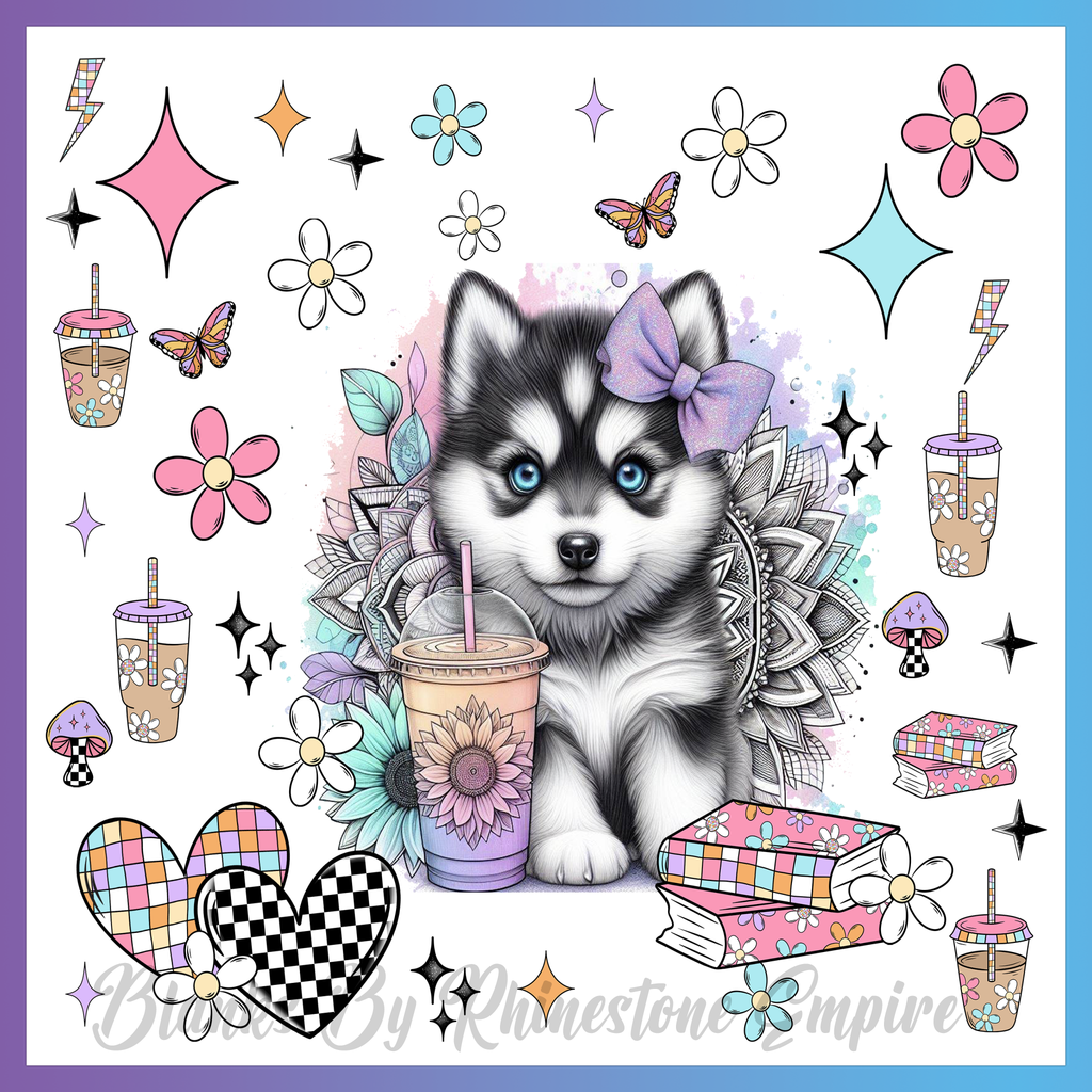 Theme: Puppy with cute, flowers, drinks, butterflies.