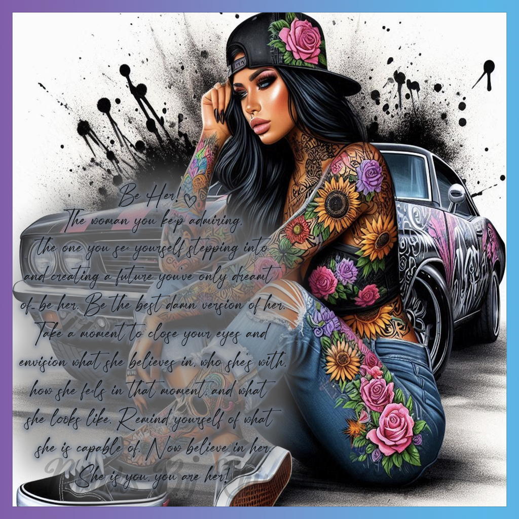 Theme: Girl with tattoo, flowers, car, urban.