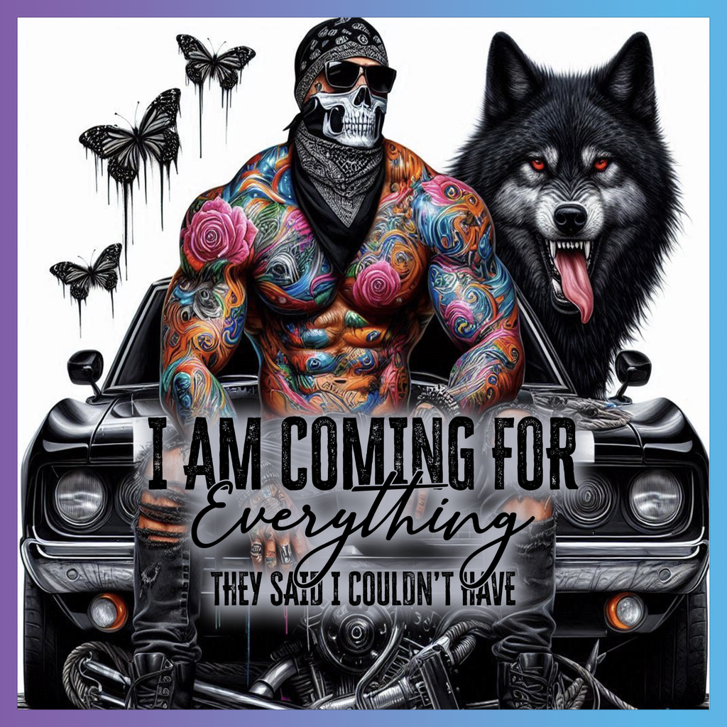 Theme: Man with tattoos, wolf, car, bandana.