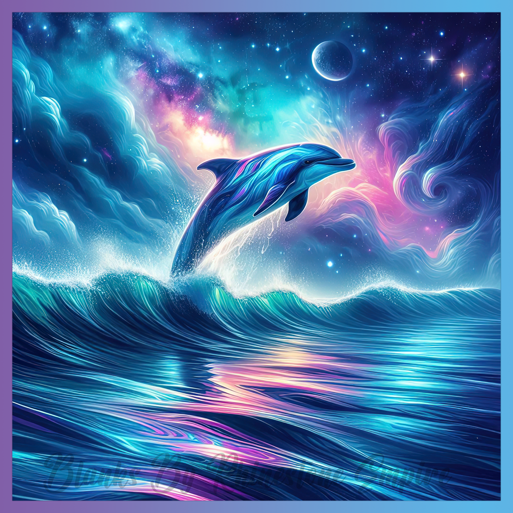 Theme: Dolphin with ocean, waves, galaxy, colorful.