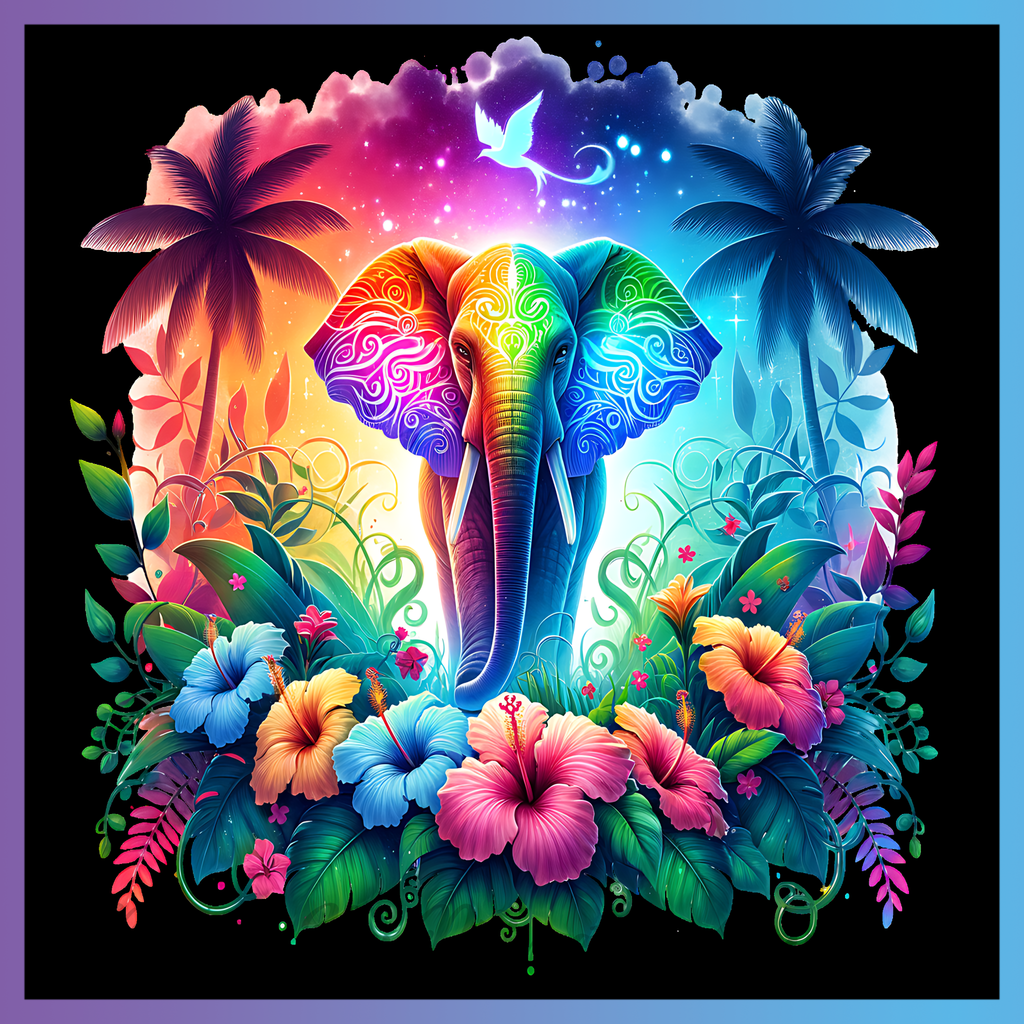 Theme: Elephant with colorful, tropical, flowers, palms.