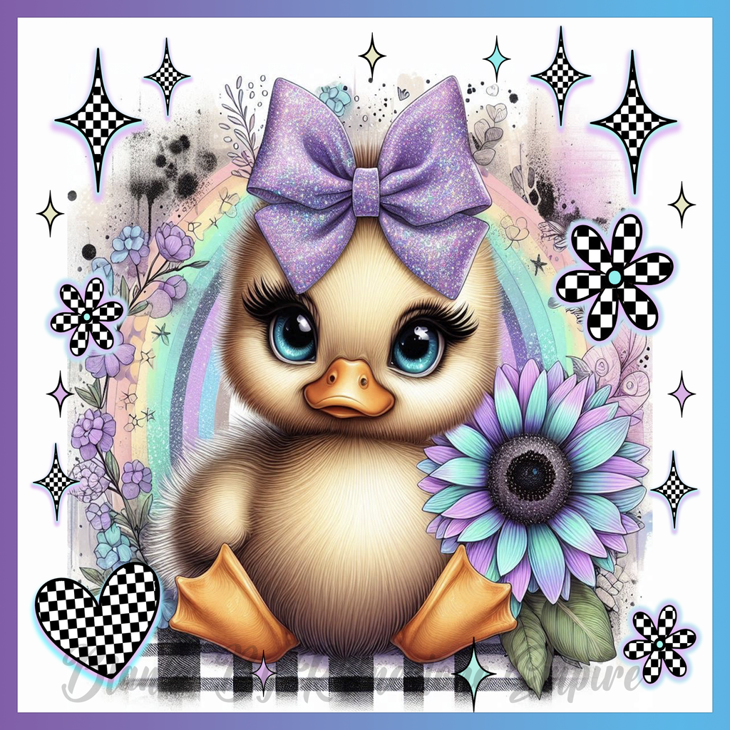 Theme: Duck with cute, bow, flowers, rainbow.