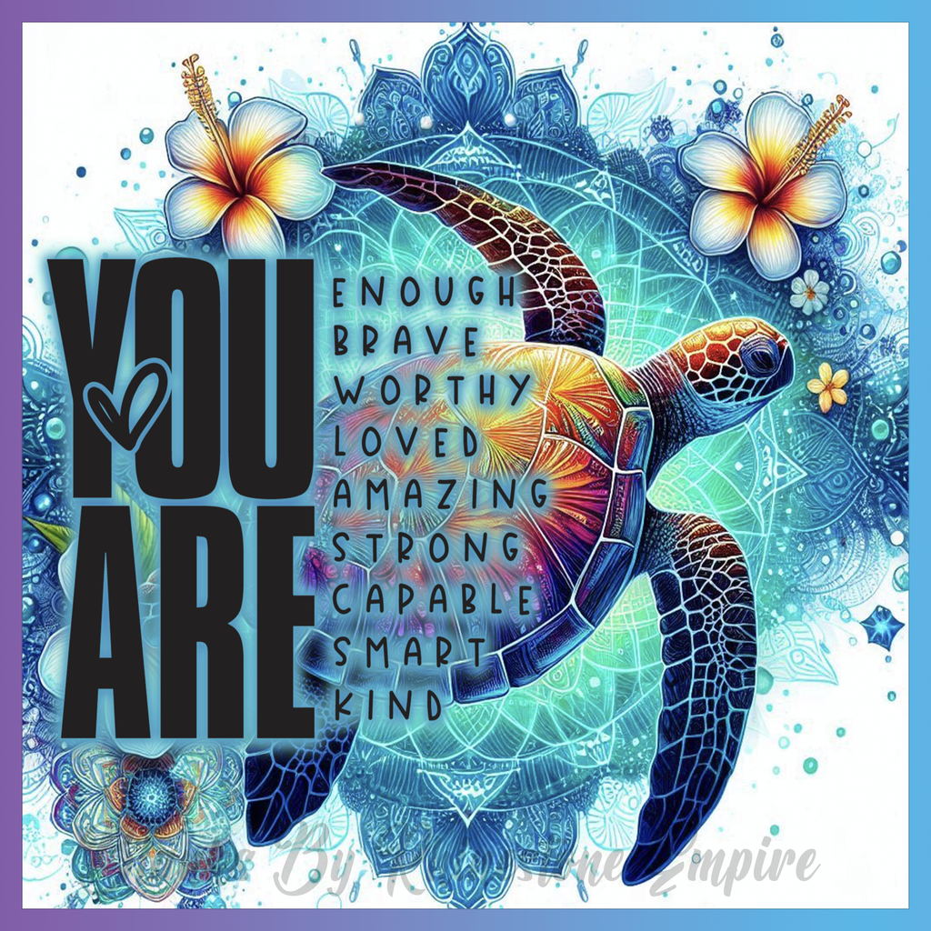 Theme: Turtle with mandala, flowers, colorful, motivational.