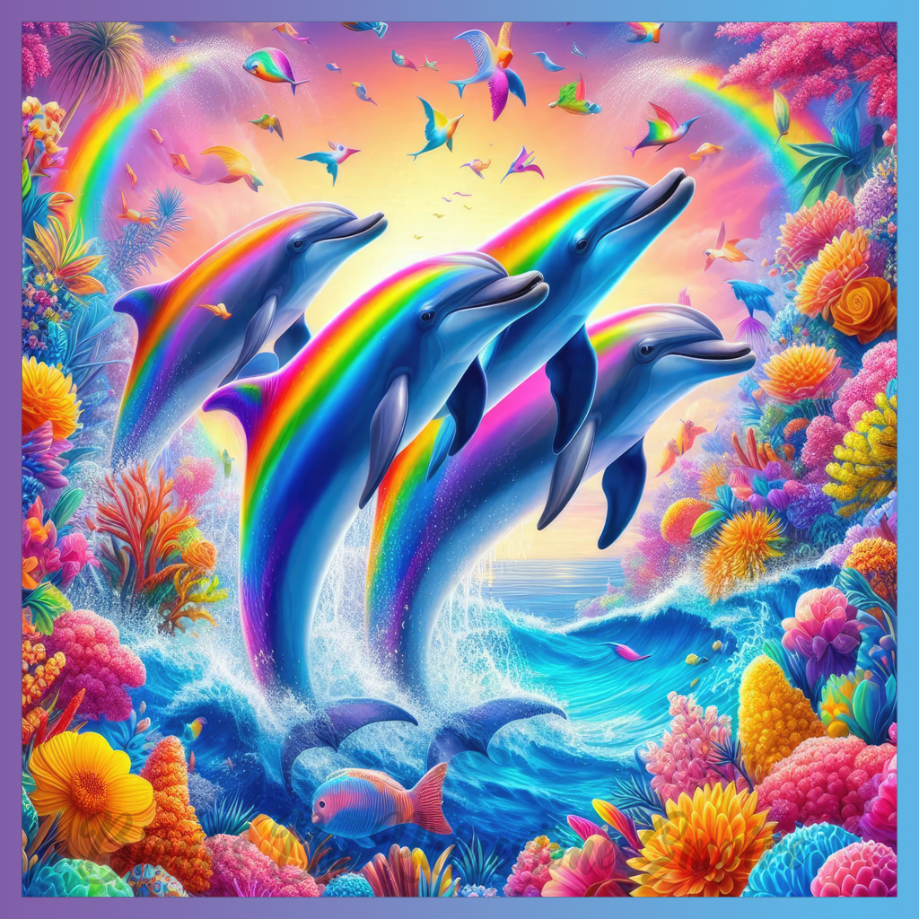 Theme: Dolphin with rainbow, ocean, coral, flowers.