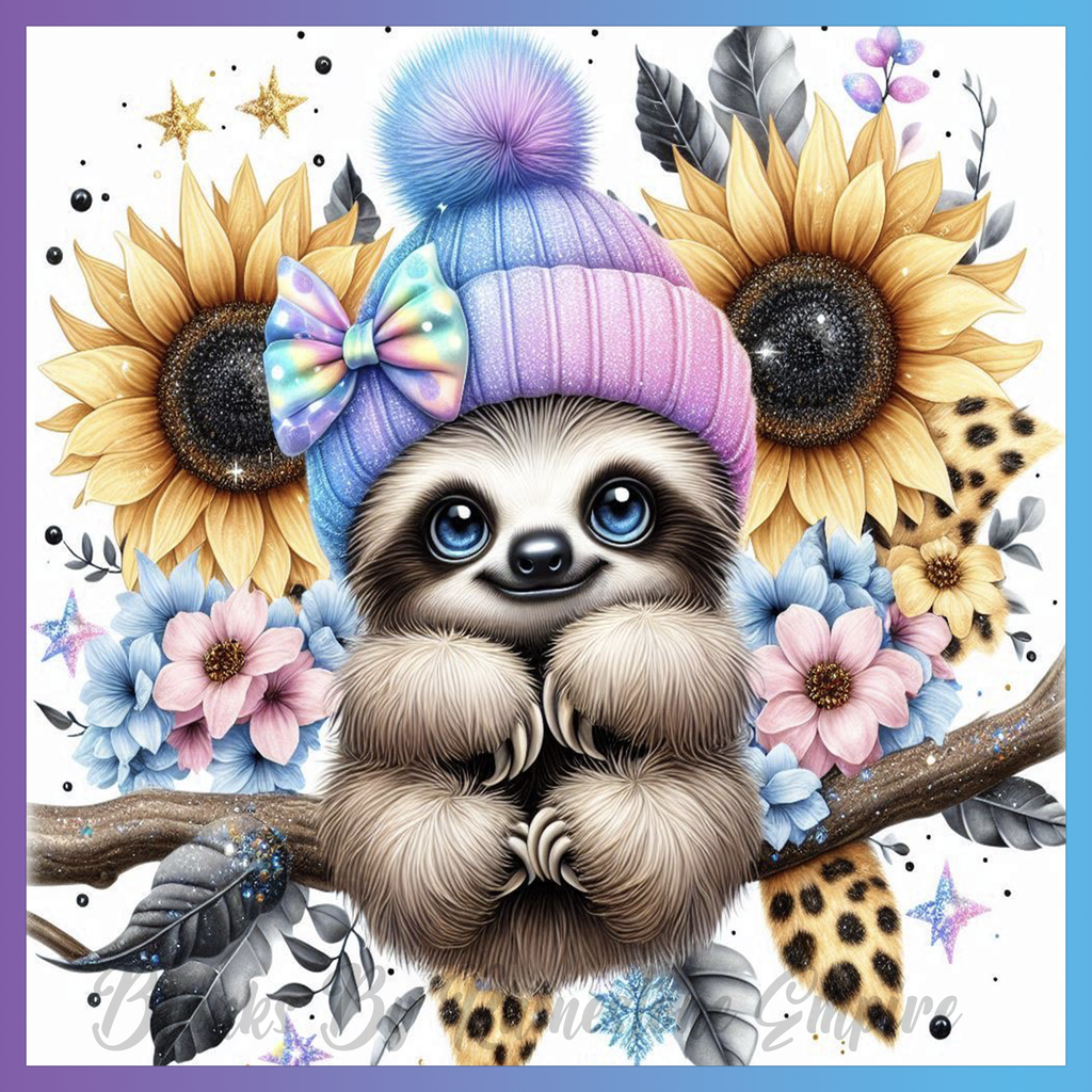 Theme: Sloth with hat, sunflowers, flowers, colorful.