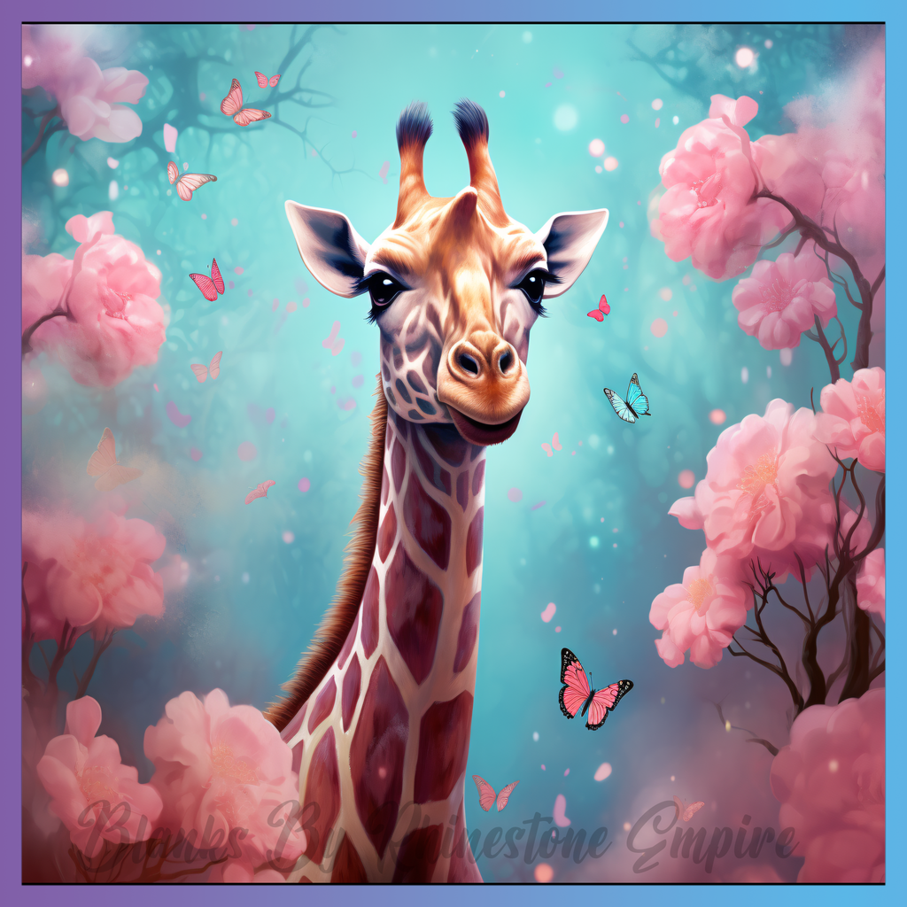 Theme: Giraffe with flowers, butterflies, pink, nature.