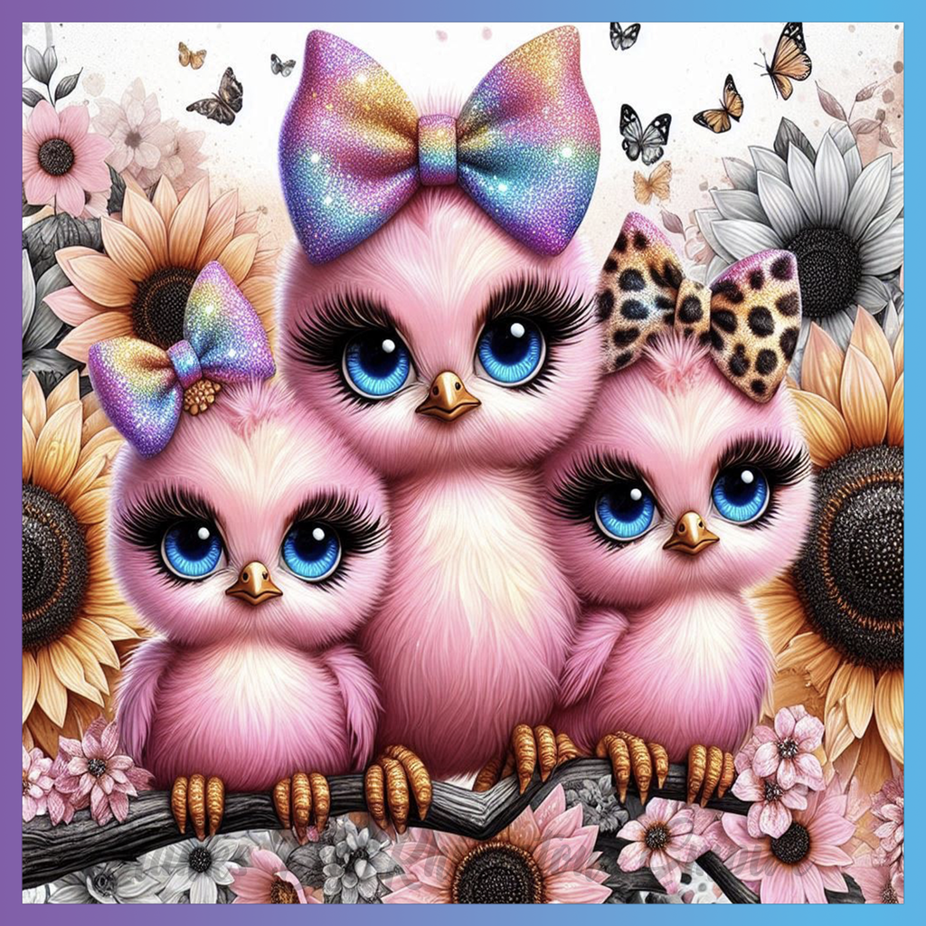 Theme: Birds with pink, bows, flowers, sunflowers.