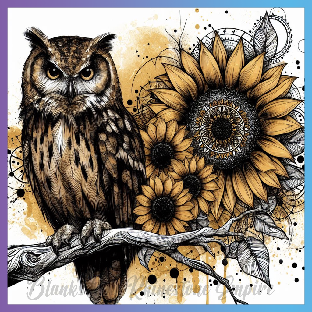 Theme: Owl with sunflowers, branch, illustration, gold.