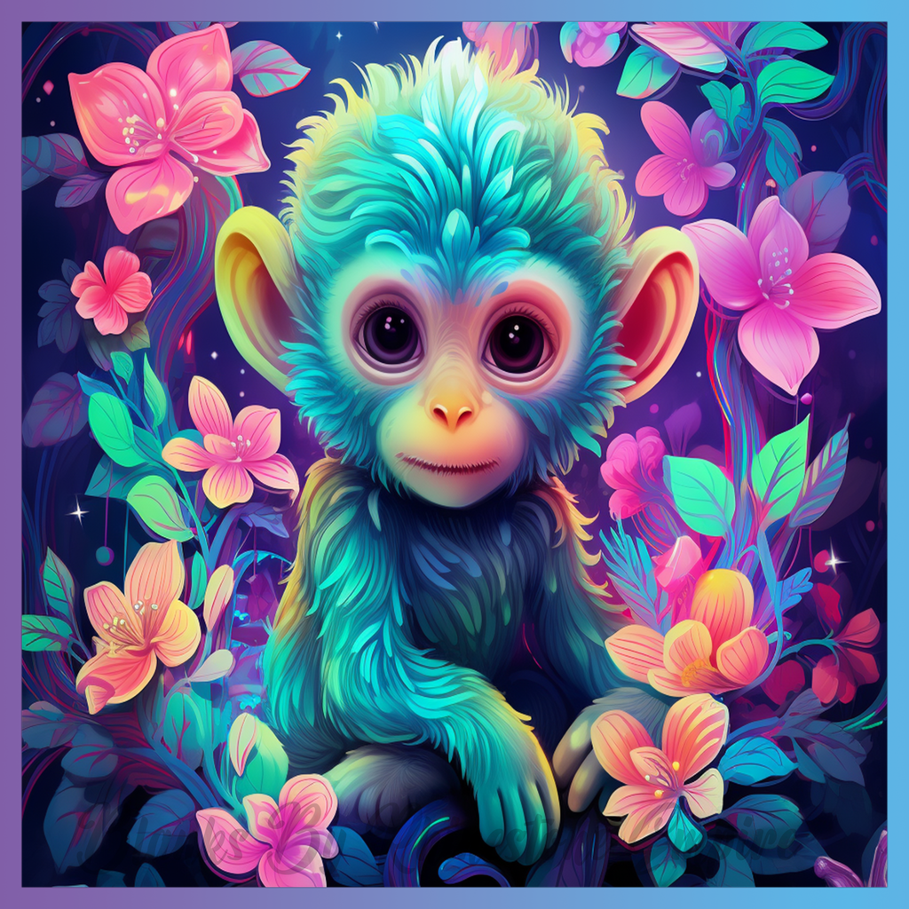 Theme: Monkey with colorful, flowers, cute, fantasy.