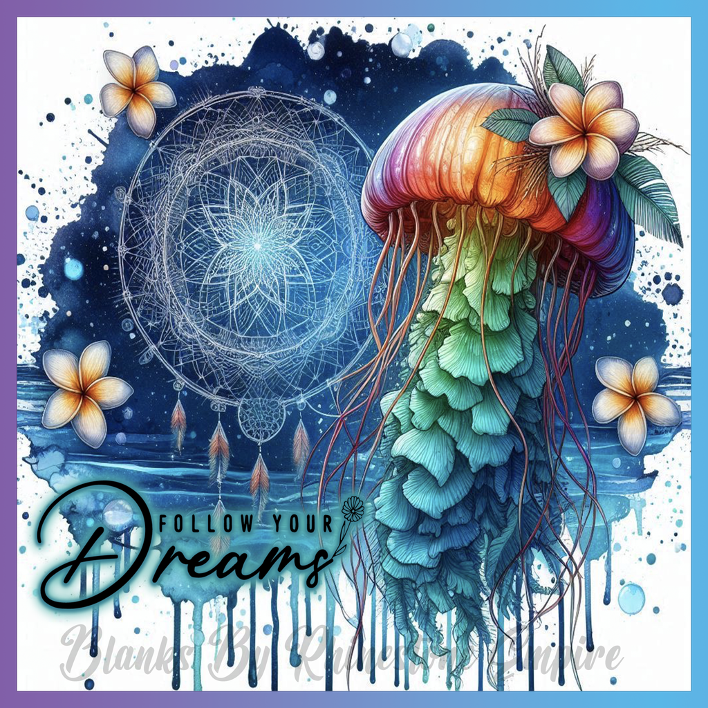 Theme: Jellyfish with dreamcatcher, flowers, ocean, blue.