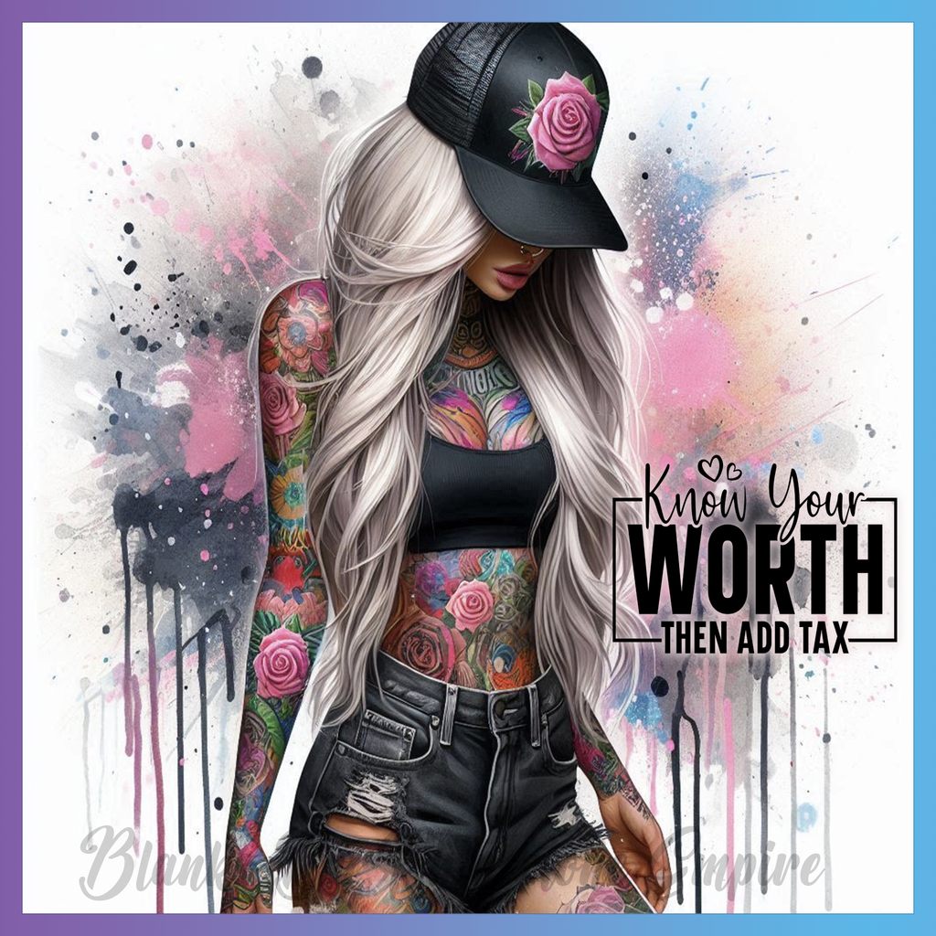 Theme: Girl with tattoo, flowers, cap, long hair.