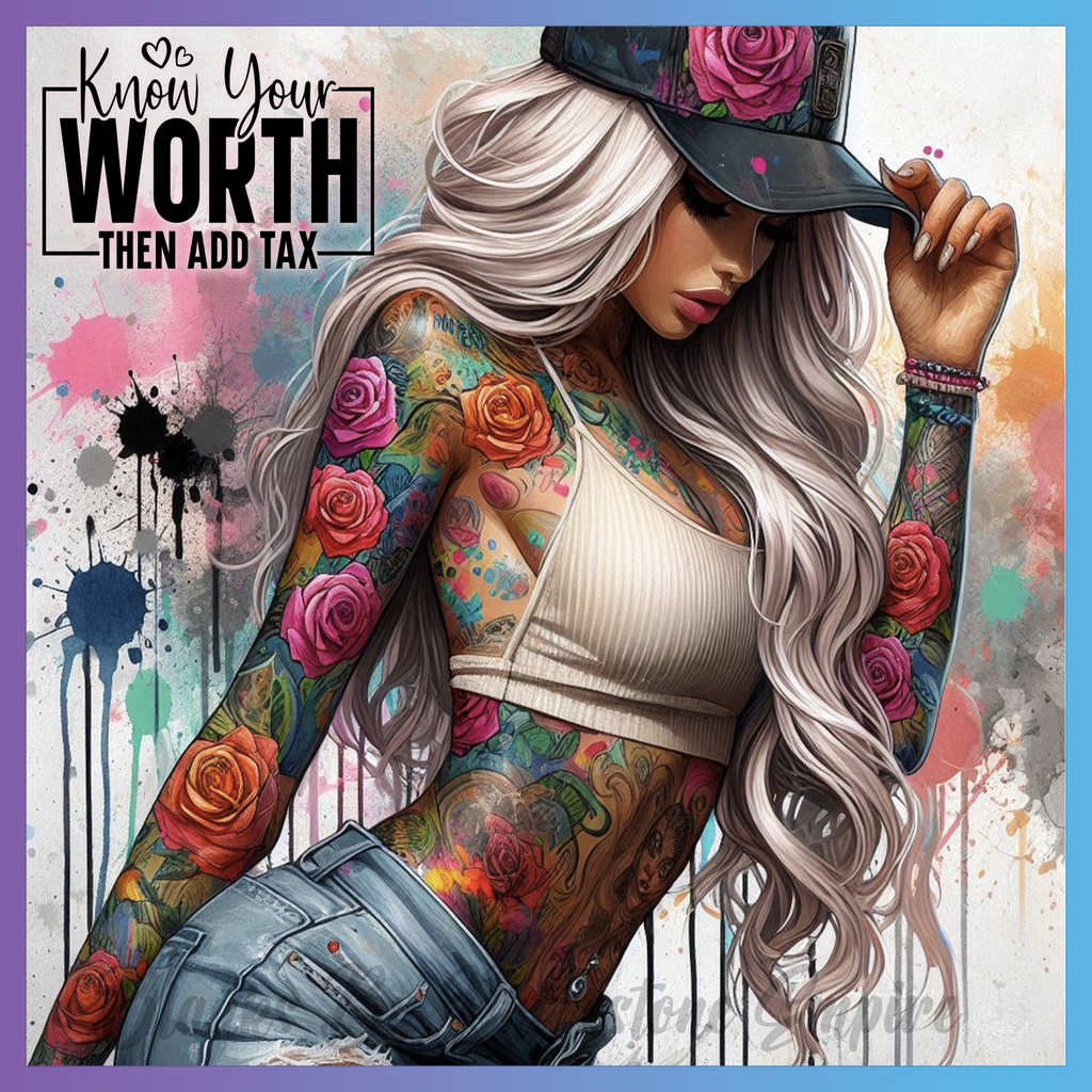 Theme: Girl with tattoo, flowers, hat, long hair.