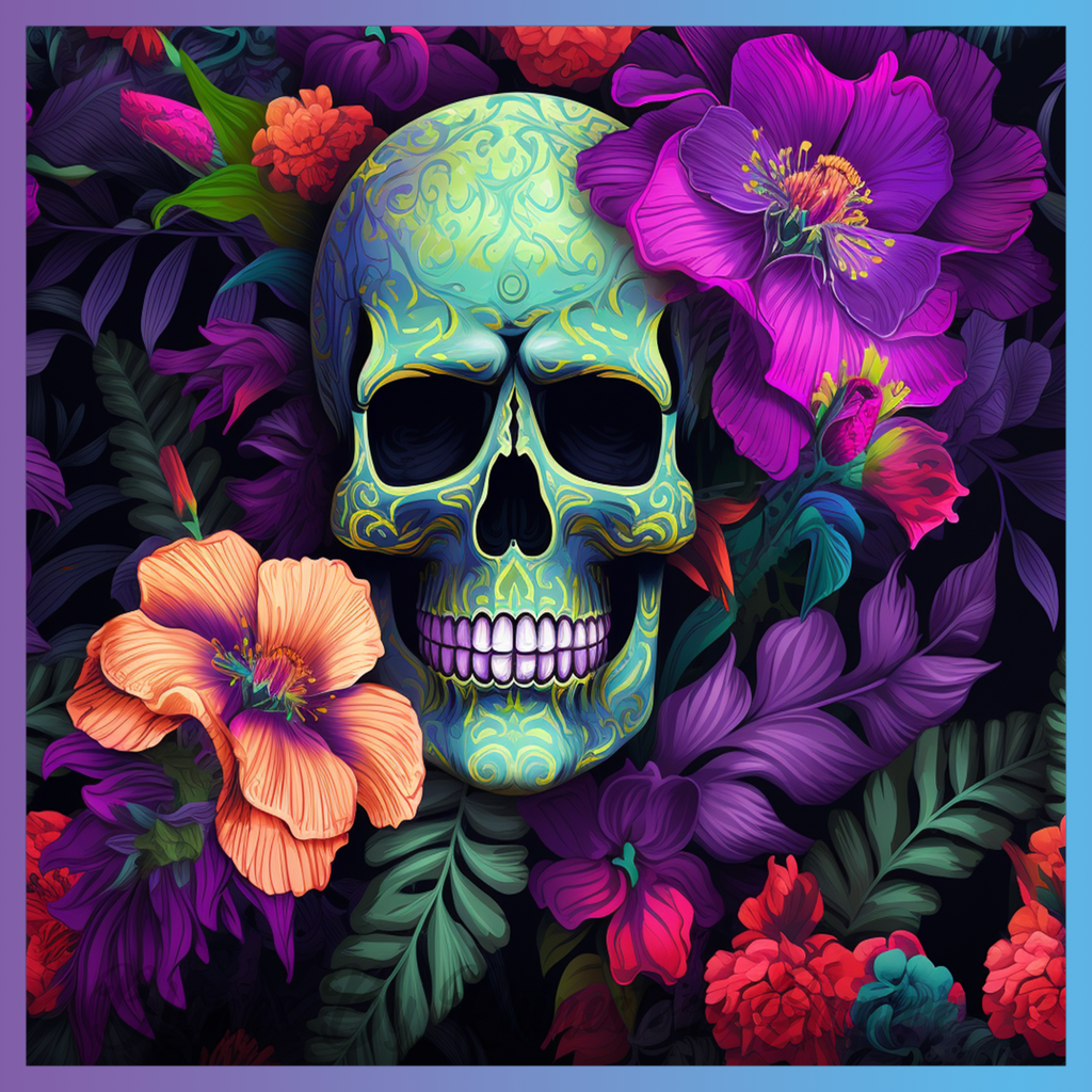 Theme: Skull with flowers, colorful, floral, ornate.