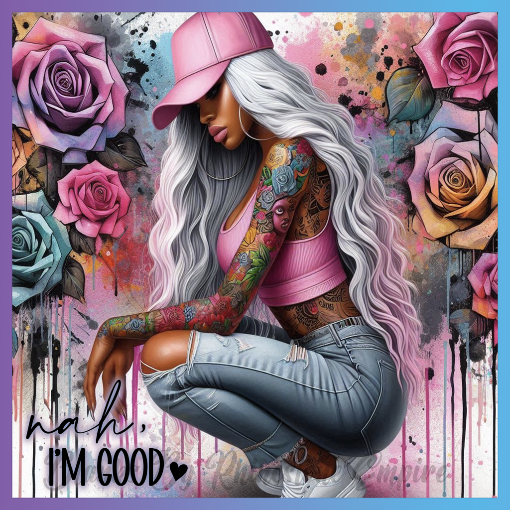 Theme: Girl with tattoo, roses, pink, cap.