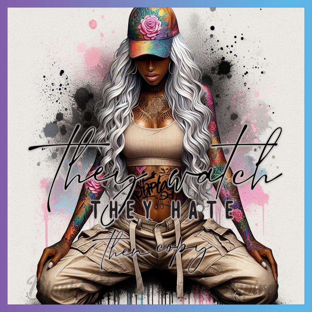 Theme: Girl with tattoo, hat, long hair, casual clothing.