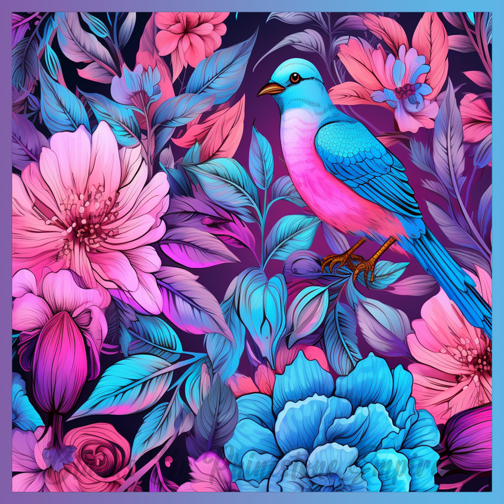 Theme: Bird with flowers, colorful, leaves, vibrant.