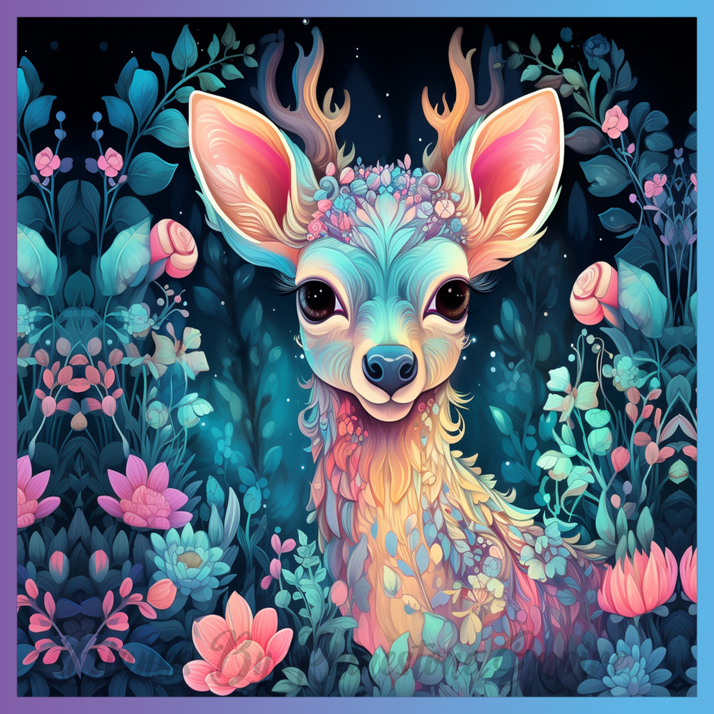 Theme: Deer with colorful, flowers, forest, whimsical.