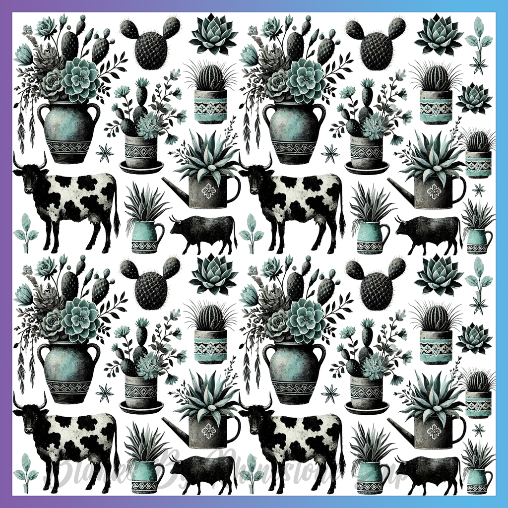 Theme: Cow with plants, cacti, flowers, pots.
