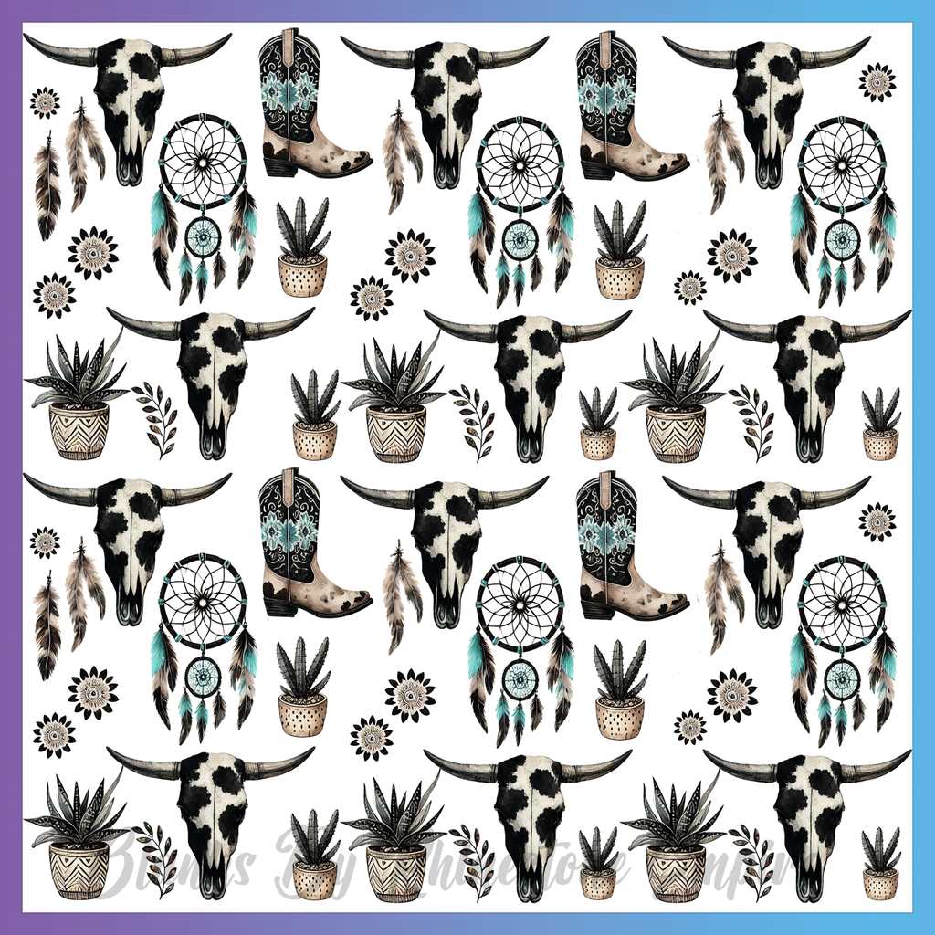 Theme: Bull with dreamcatcher, boots, feathers, plants.