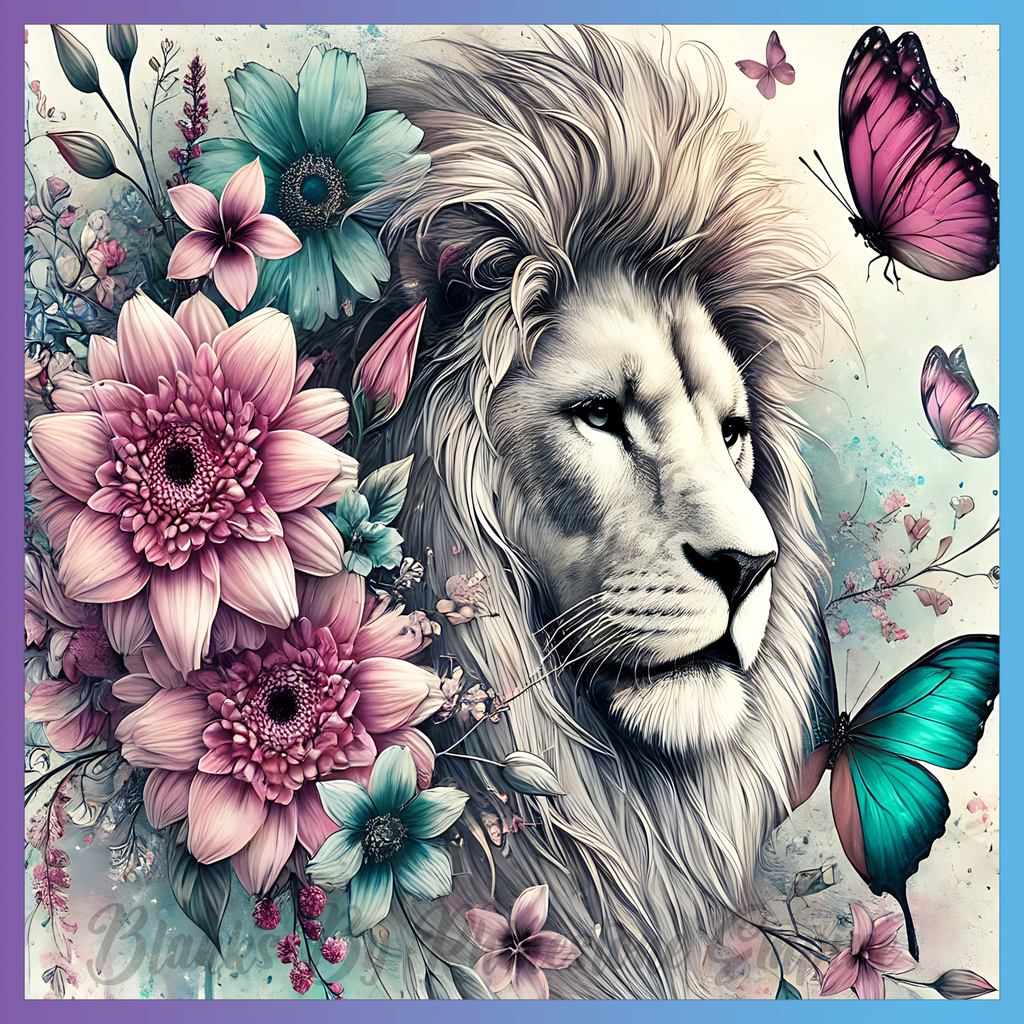 Theme: Lion with flowers, butterflies, colorful, nature.