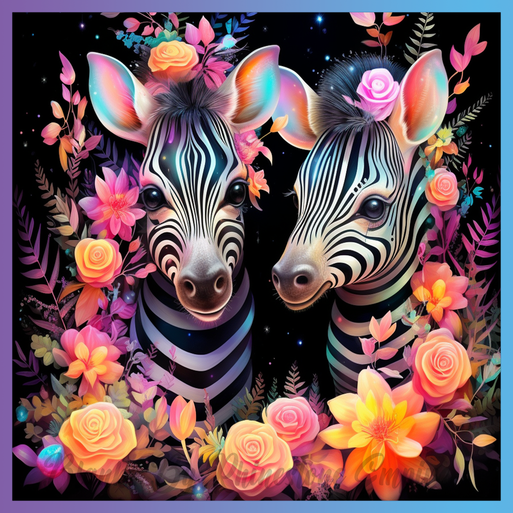 Theme: Zebra with flowers, colorful, tropical, nature.