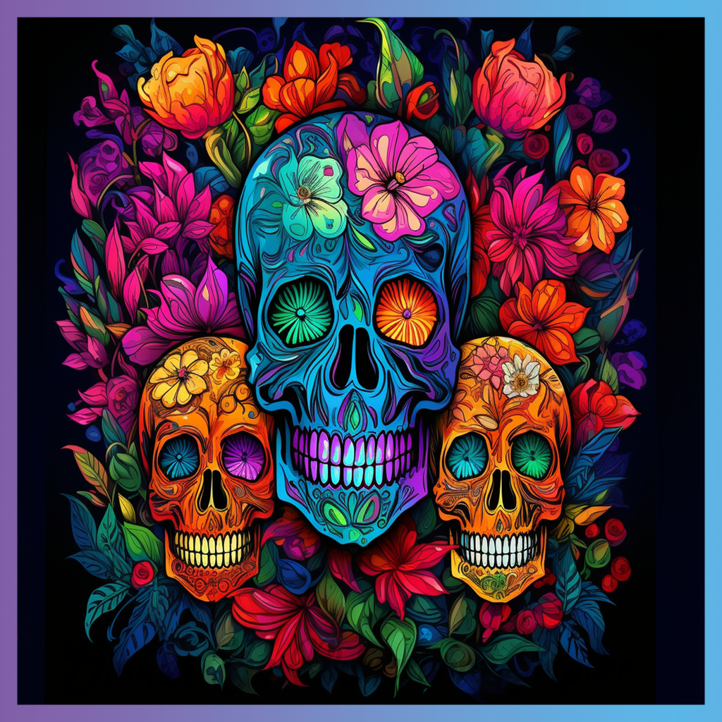 Theme: Skull with flowers, colorful, ornate, decorative.