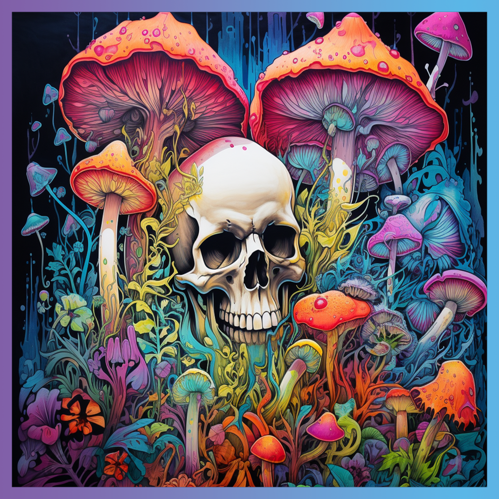 Theme: Skull with mushrooms, colorful, flora, fantasy.