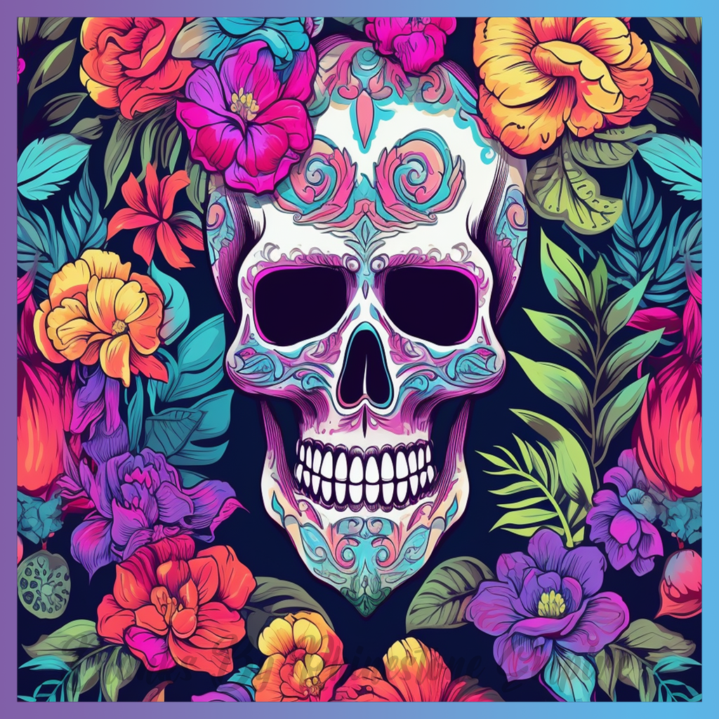 Theme: Skull with flowers, colorful, ornate, leaves.