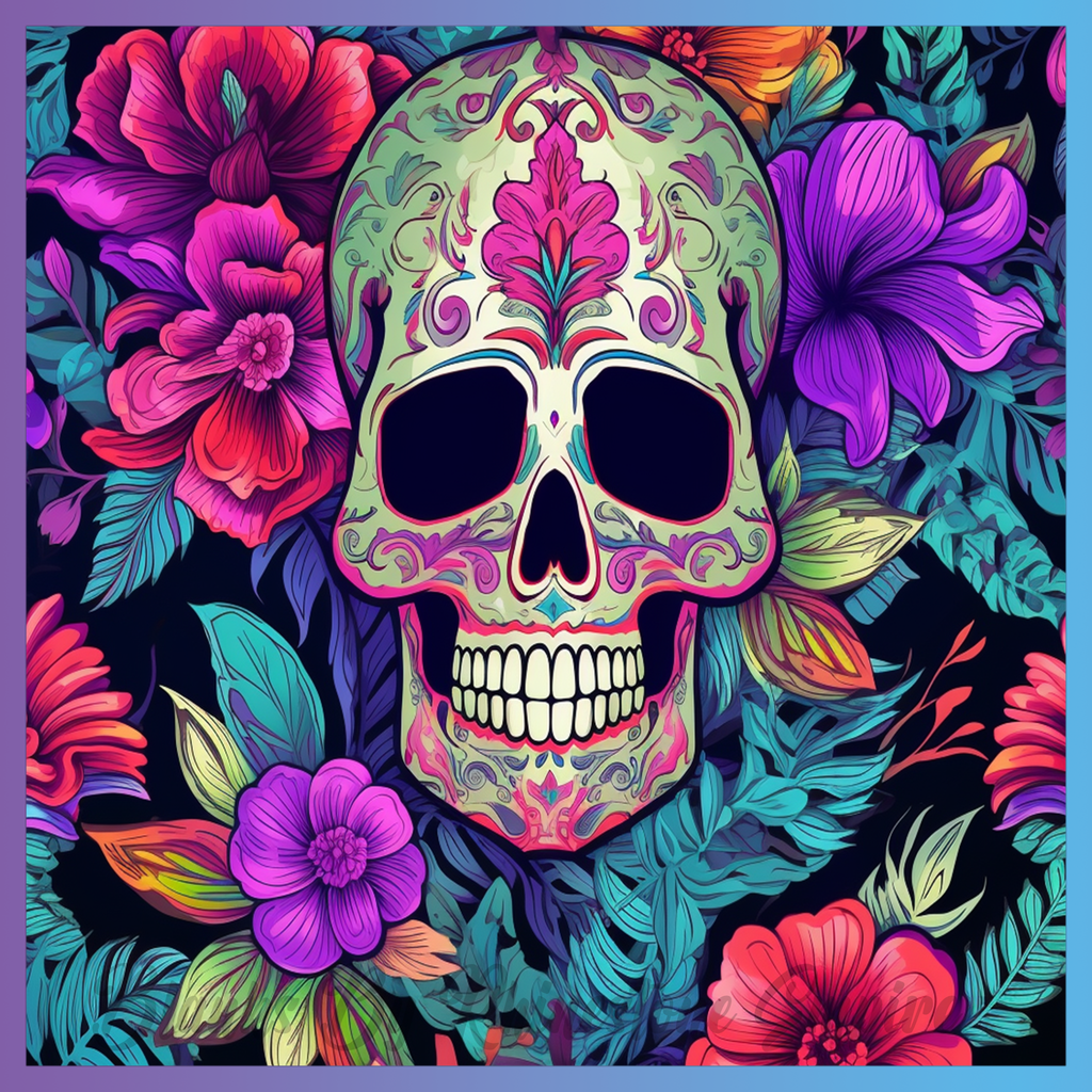 Theme: Skull with flowers, colorful, ornate, pattern.