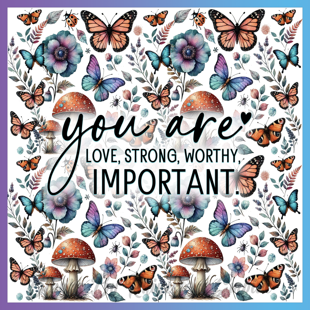 Theme: Butterfly with flowers, mushrooms, text, colorful.