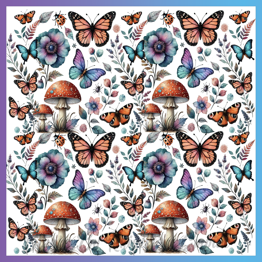 Theme: Butterfly with flowers, mushrooms, insects, colorful.