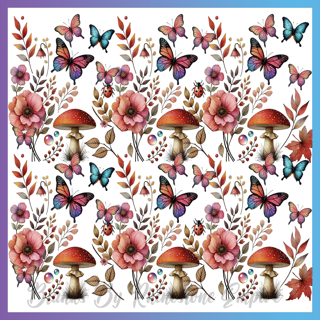 Theme: Butterfly with flowers, mushrooms, leaves, ladybugs.