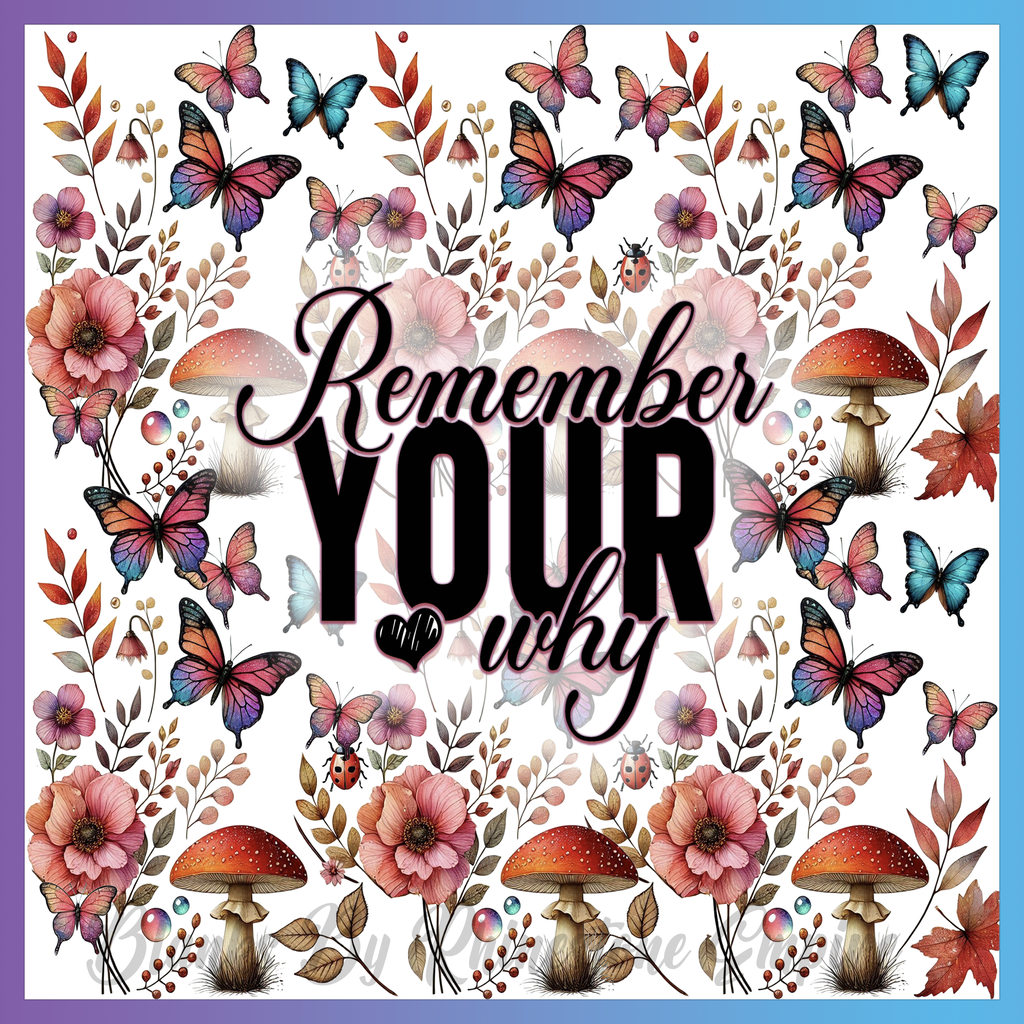 Theme: Butterfly with flowers, mushrooms, leaves, quote.