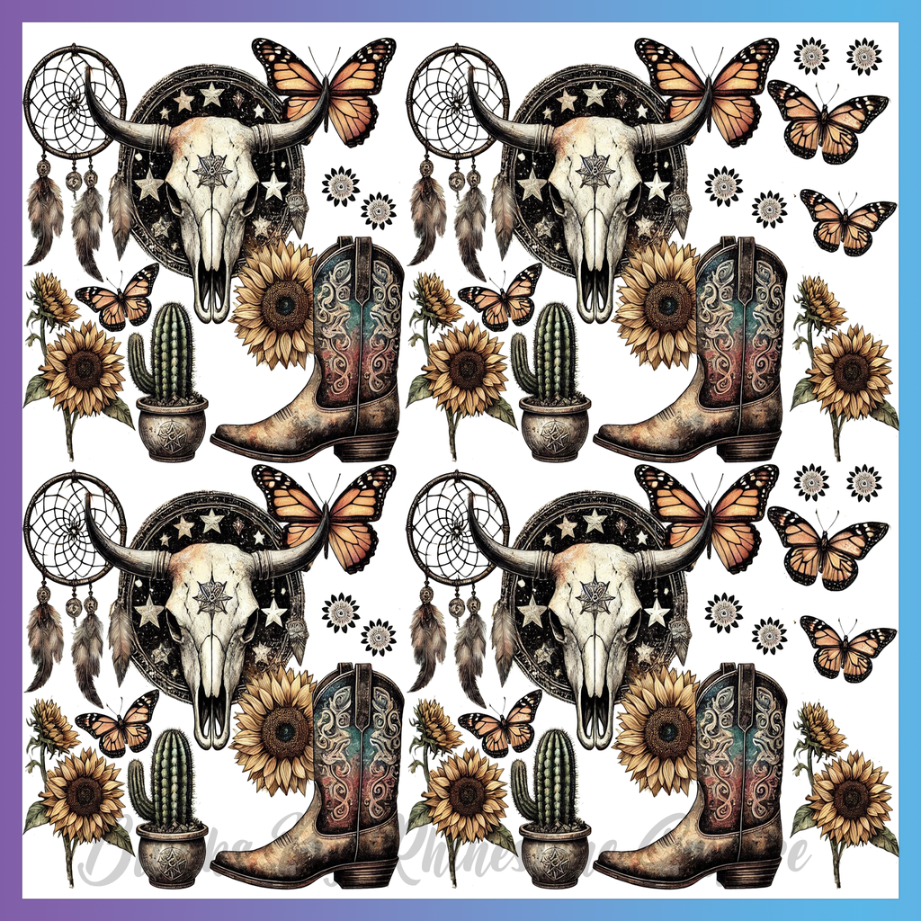 Theme: Skull with butterflies, boots, sunflowers, cacti.