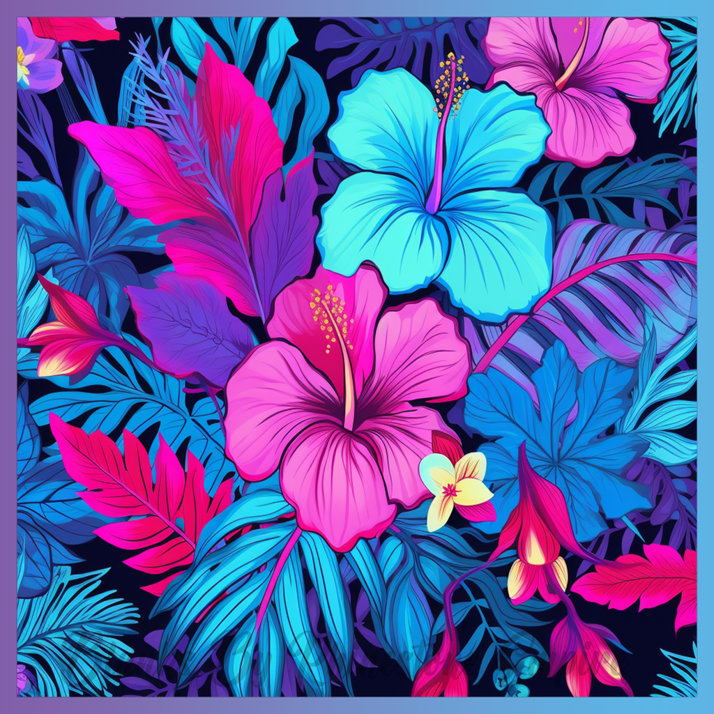 Theme: Flower with tropical, vibrant, leaves, blue.