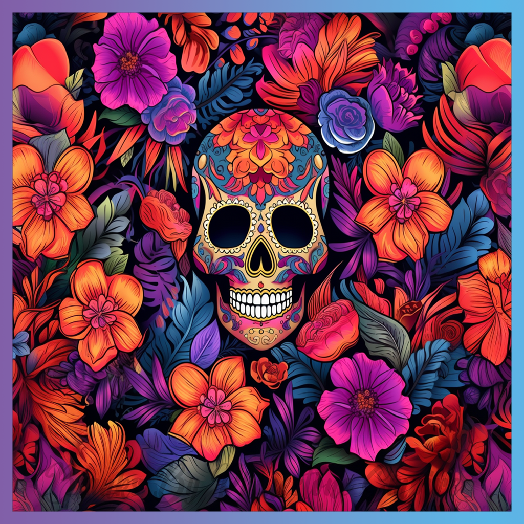 Theme: Skull with flowers, colorful, pattern, vibrant.