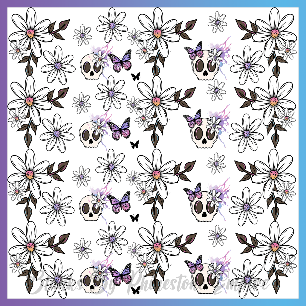 Theme: Skull with flowers, butterflies, pattern, black.