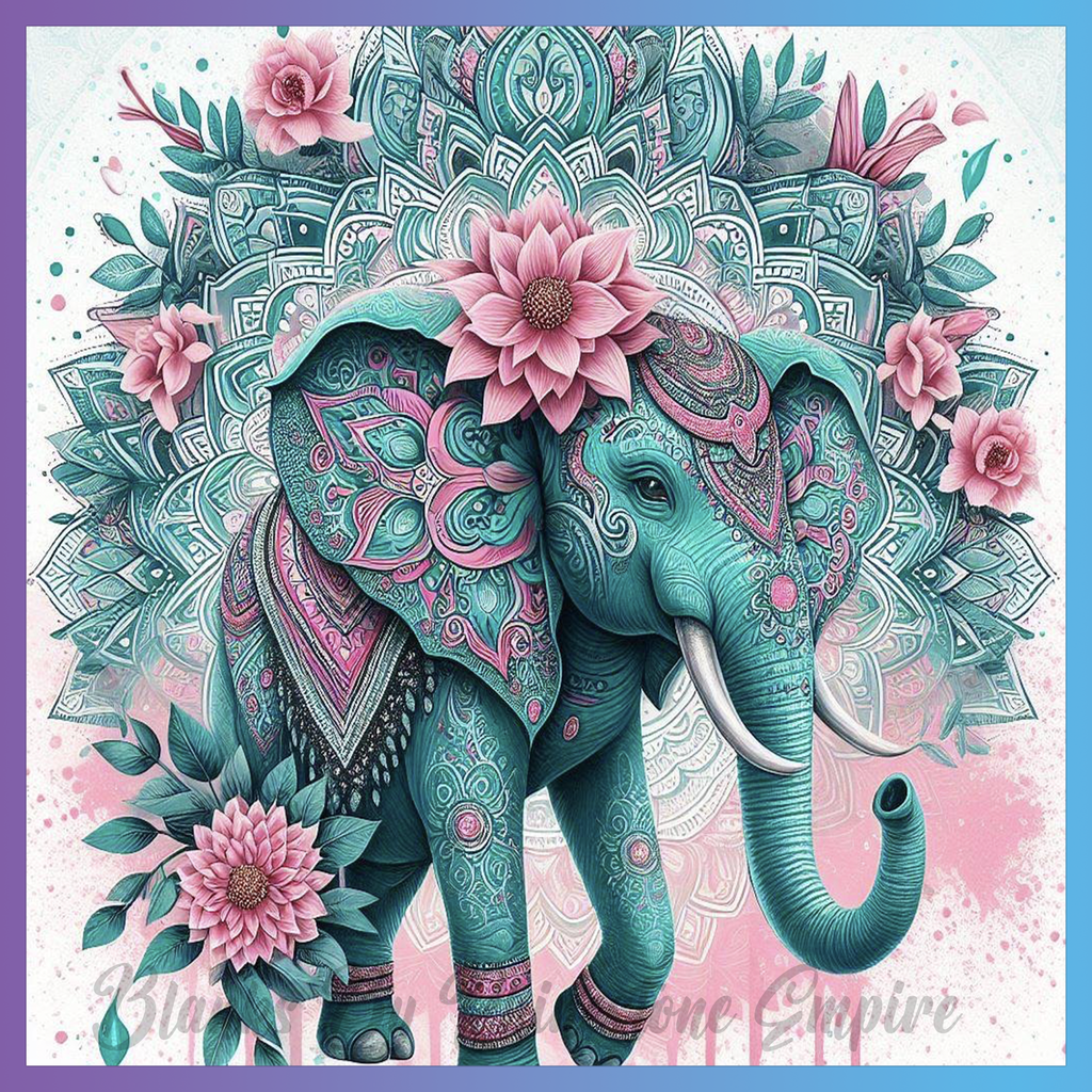 Theme: Elephant with mandala, flowers, ornate, colorful.