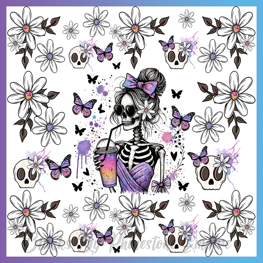 Theme: Skeleton with flowers, butterflies, skulls, drink.