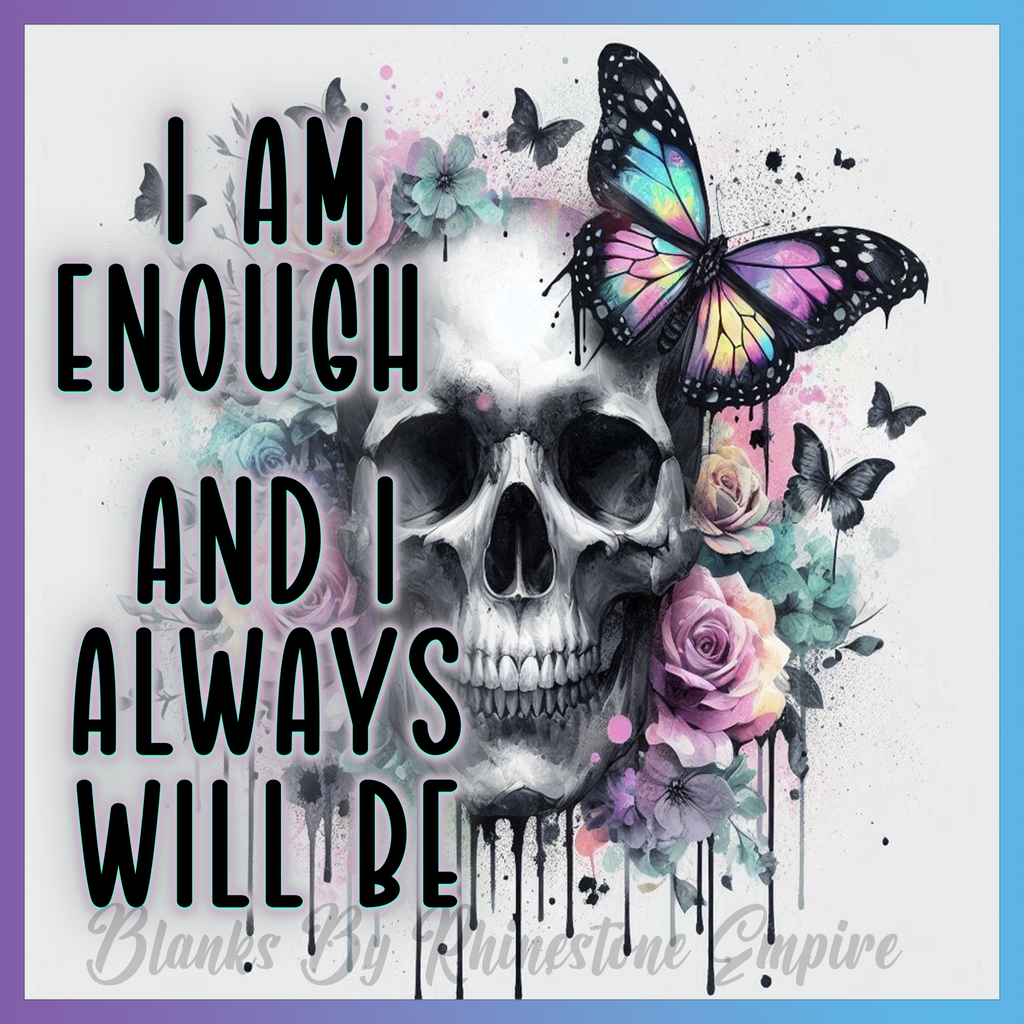 Theme: Skull with butterfly, flowers, colorful, text.