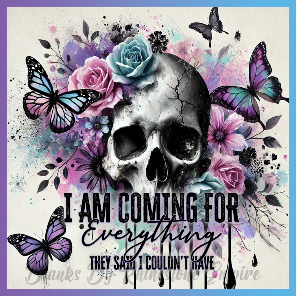 Theme: Skull with butterflies, flowers, colorful, artistic.