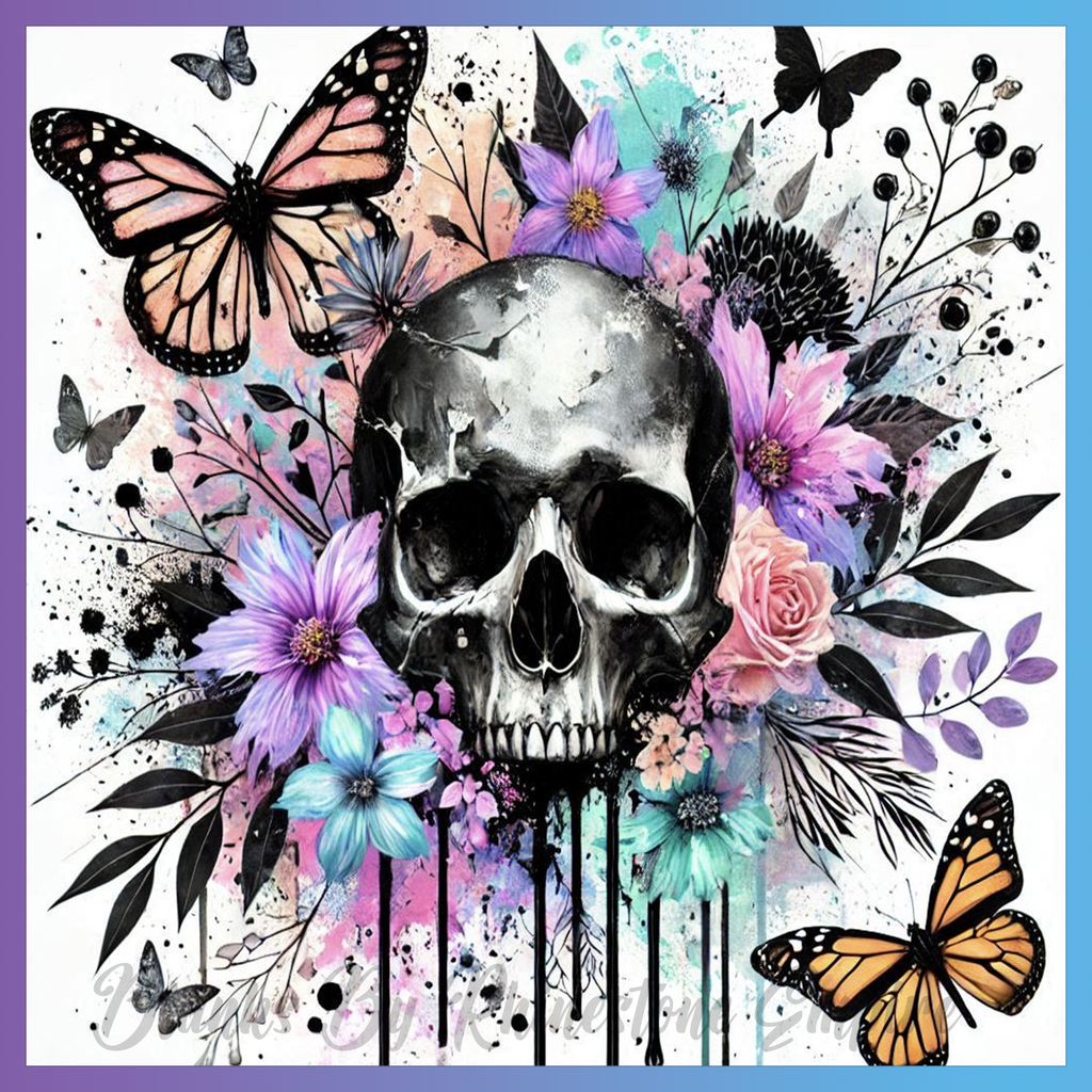 Theme: Skull with butterflies, flowers, colorful, abstract.